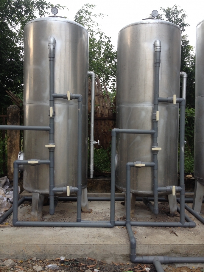 - Bơm lọc sẽ hút từ khoang nắng, đẩy vào cột lọc, dưới tác dụng của vật liệu lọc sẽ giữ lại cặn bẩn, sắt, mangan...có trong nước,